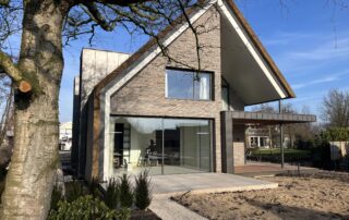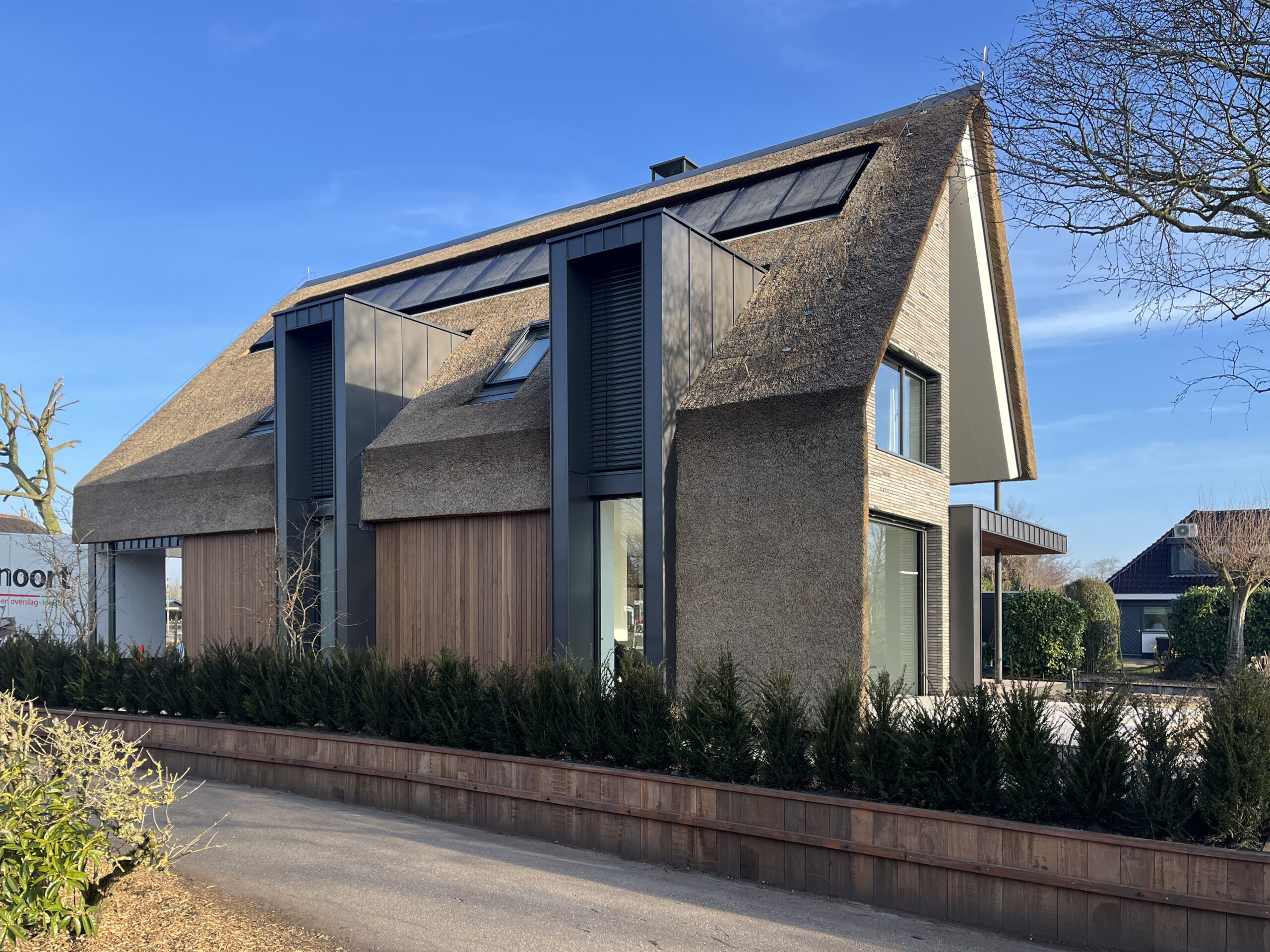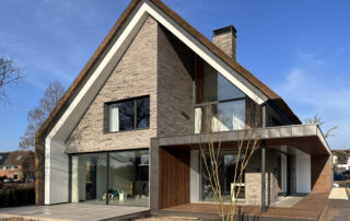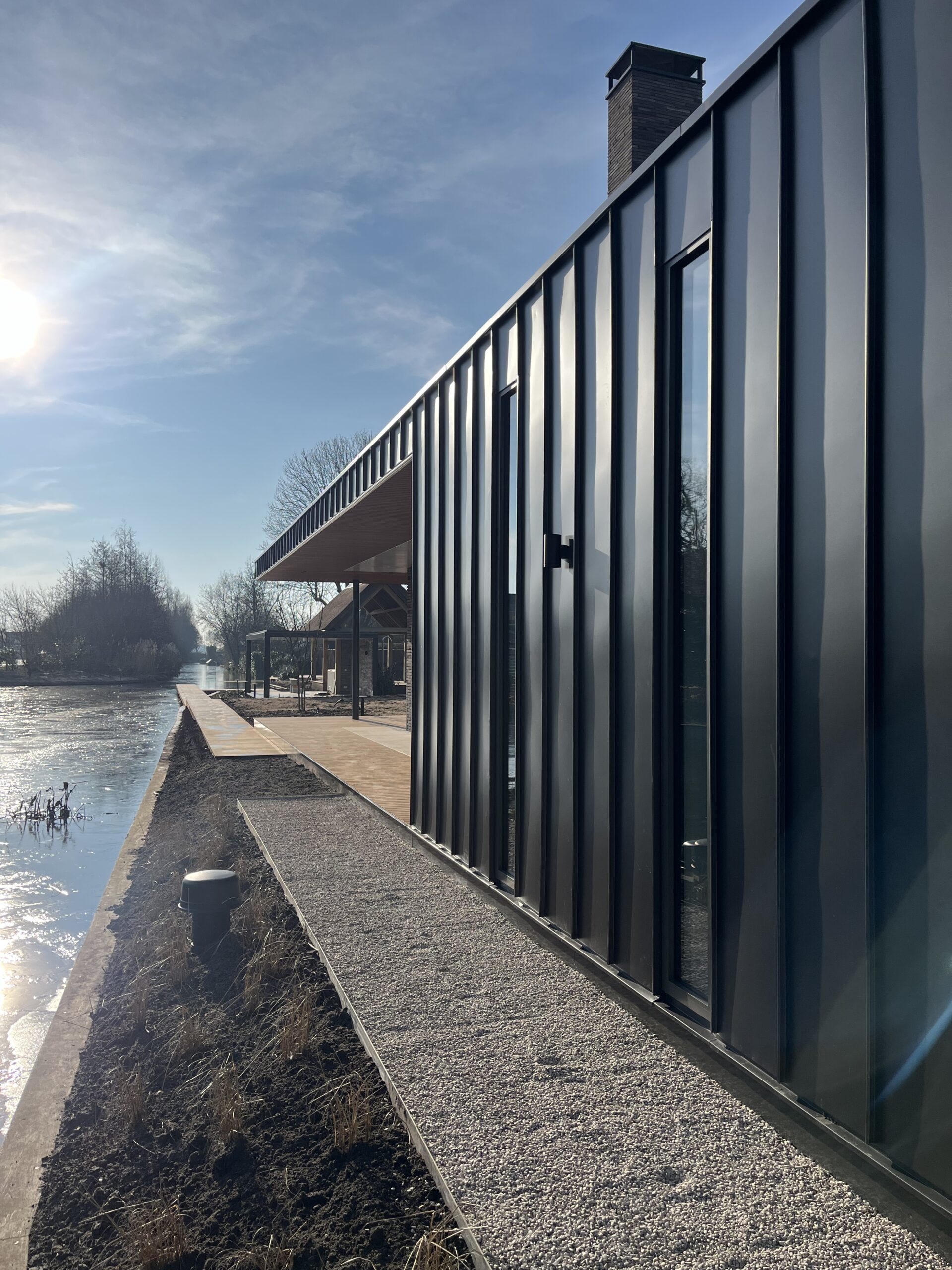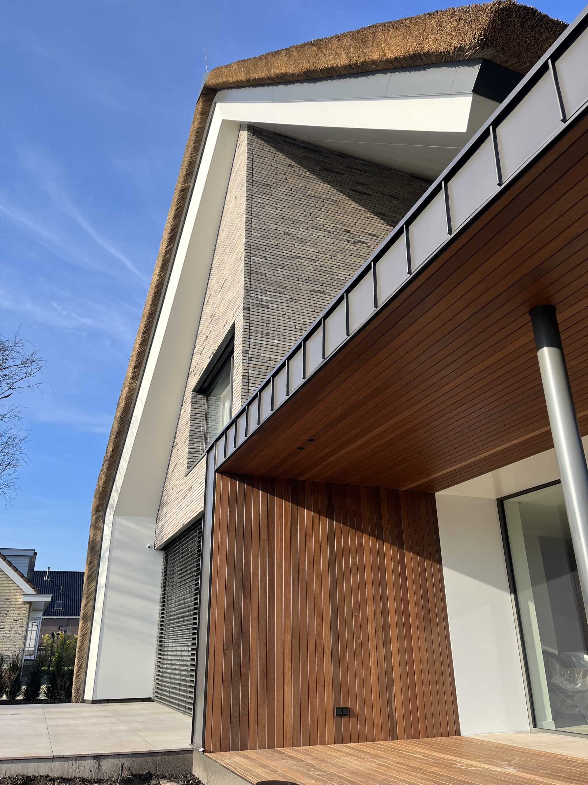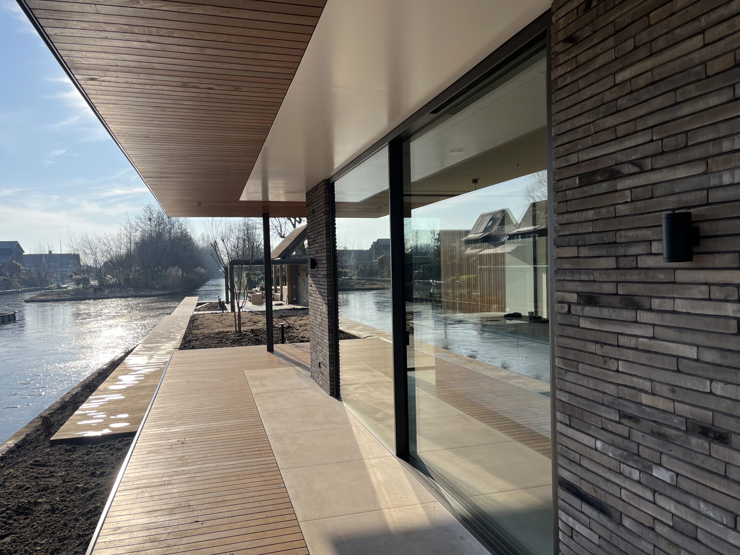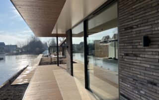 Het samenspel met de langgerekte gevelstenen, verticale houten delen, slanke gevelkozijnen en eiken constructies zorgt voor een natuurlijke, warme en moderne villa die past bij de omgeving aan het water en aansluit op het gebruik en de beleving van het nieuwe tuingebied.