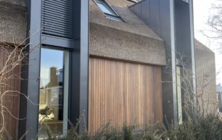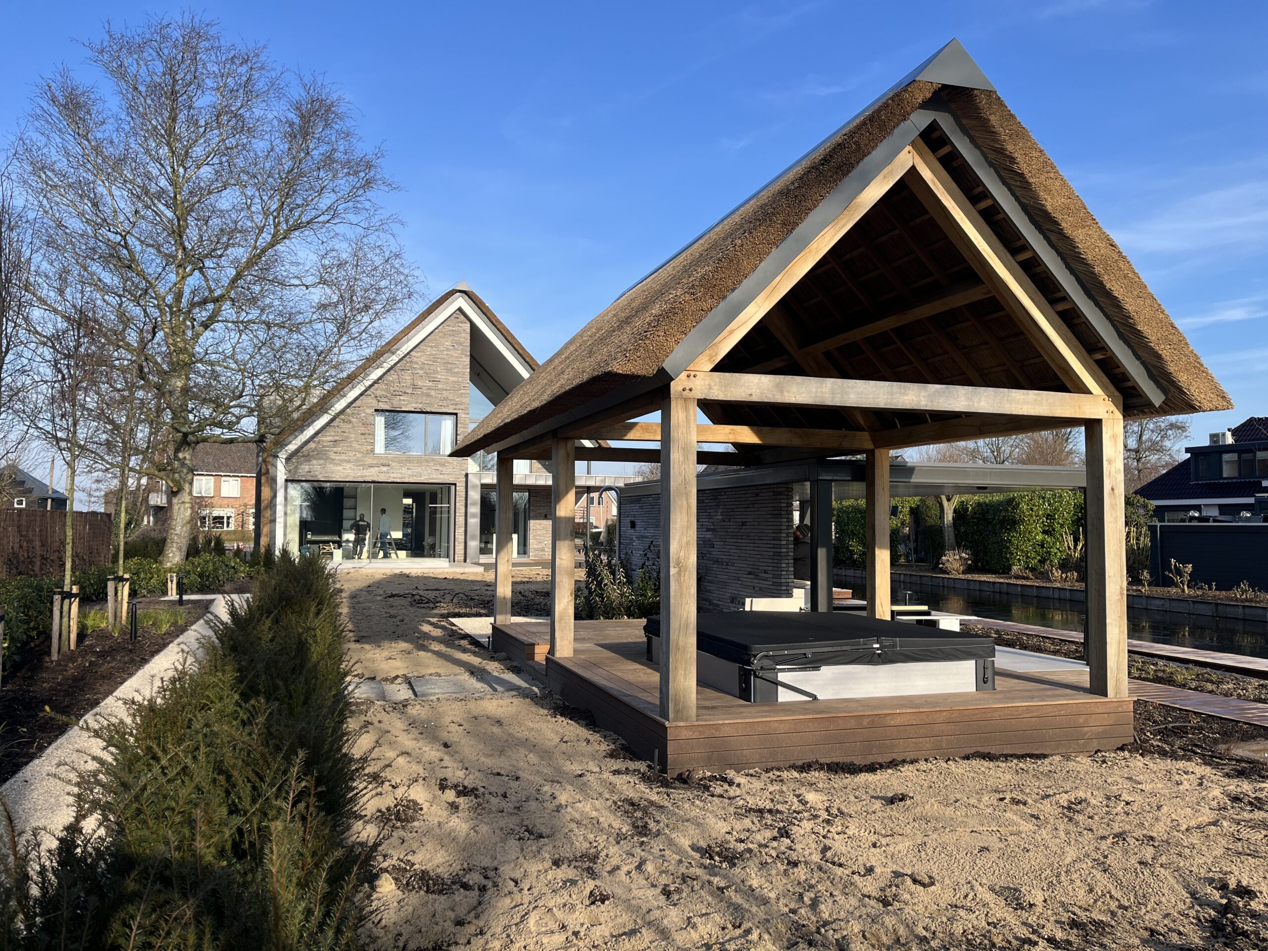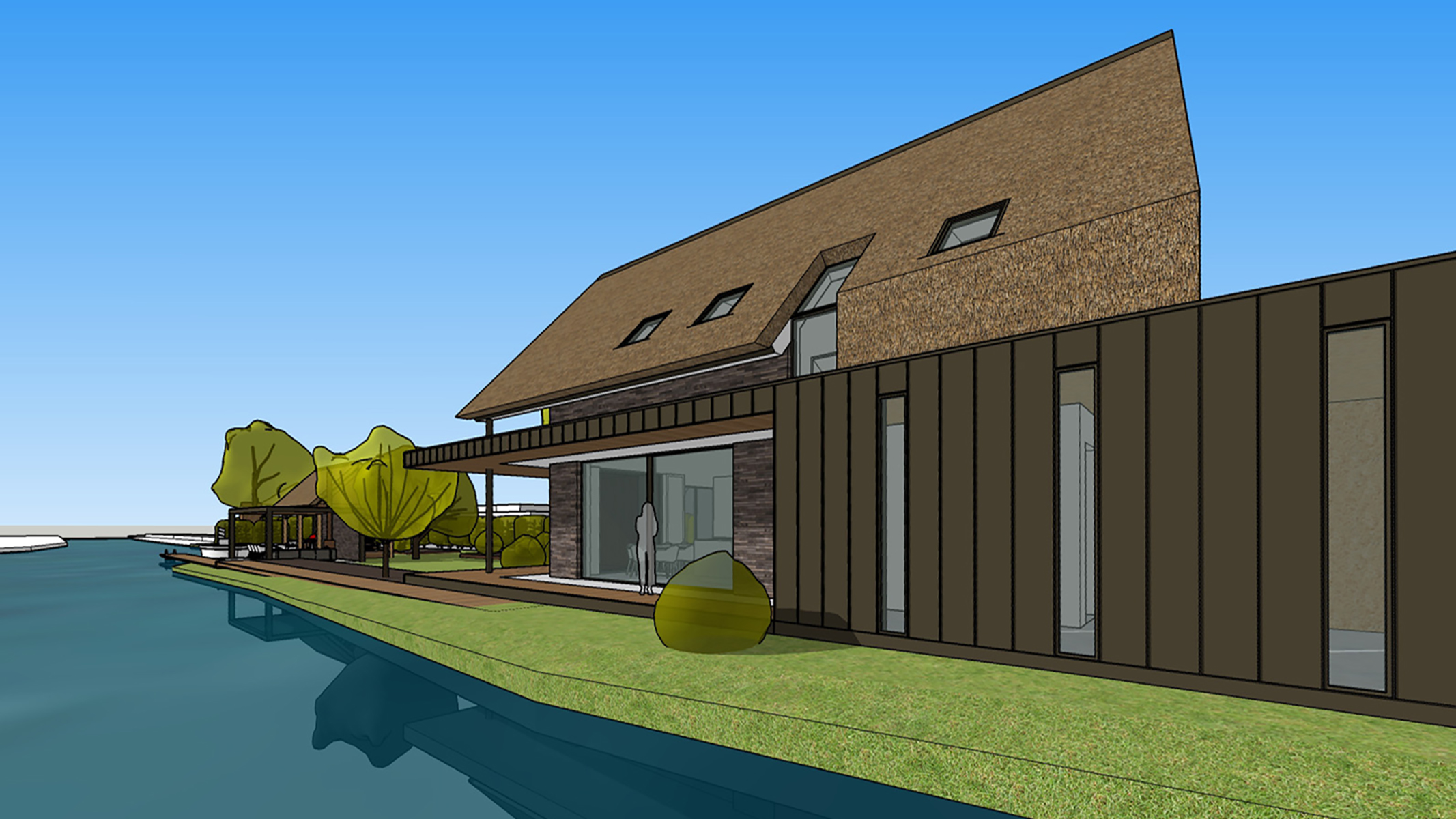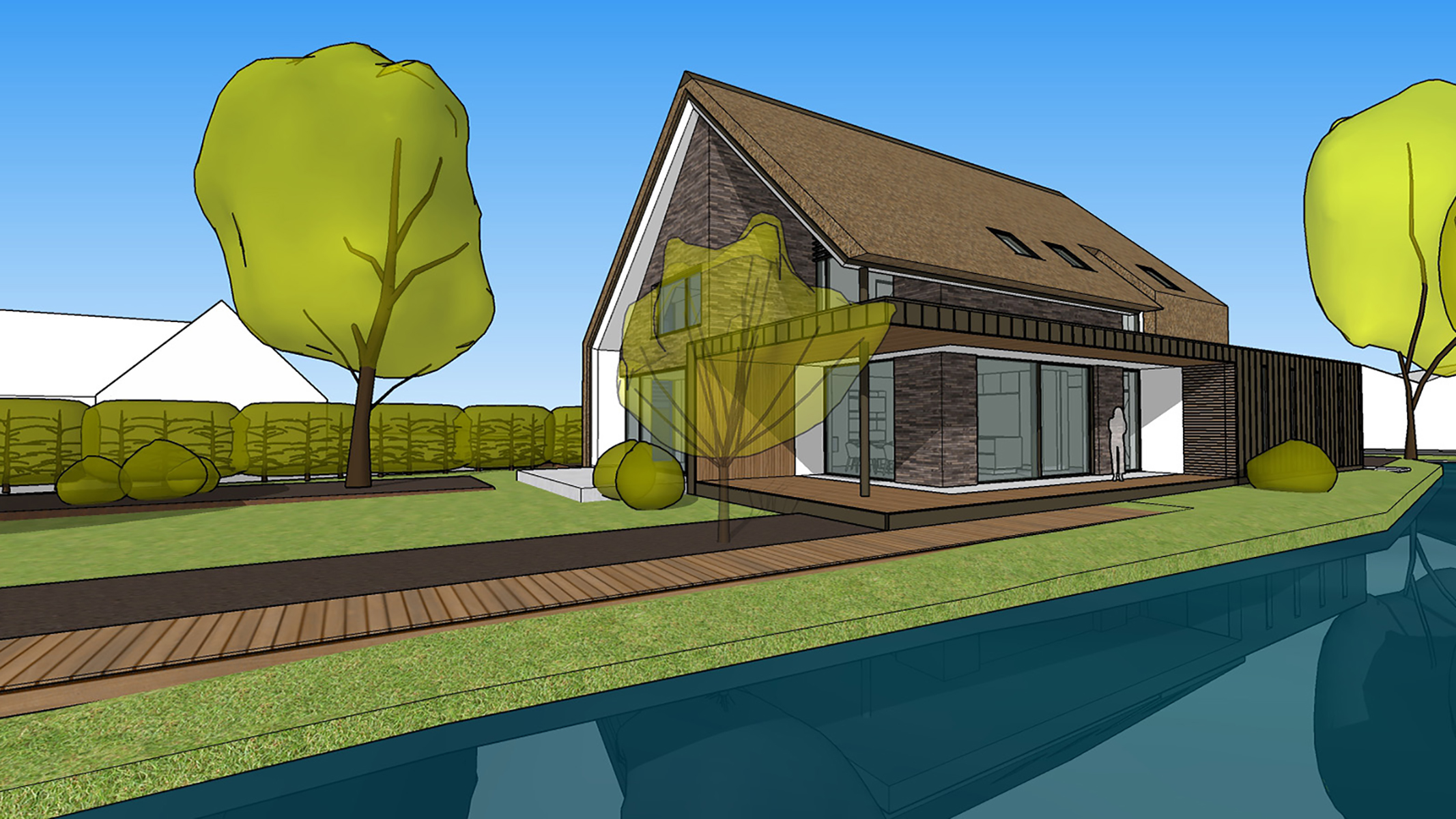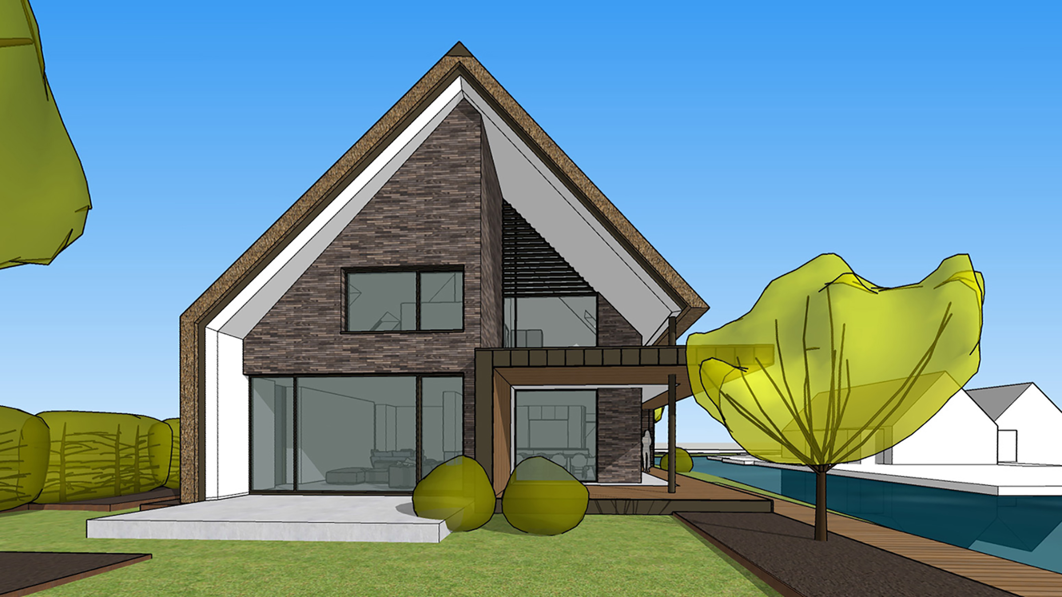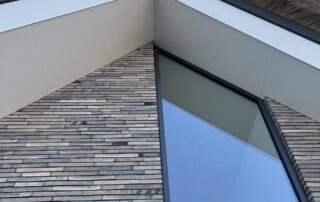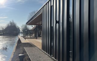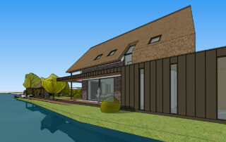 Het samenspel met de langgerekte gevelstenen, verticale houten delen, slanke gevelkozijnen en eiken constructies zorgt voor een natuurlijke, warme en moderne villa die past bij de omgeving aan het water en aansluit op het gebruik en de beleving van het nieuwe tuingebied.