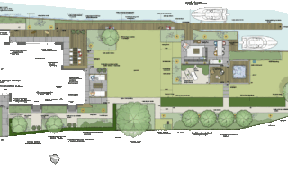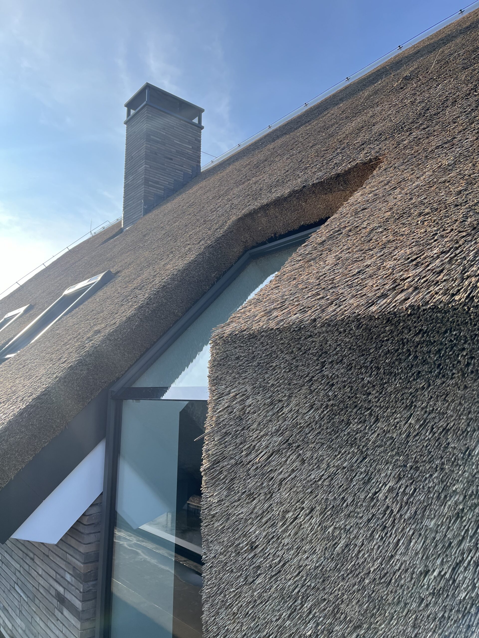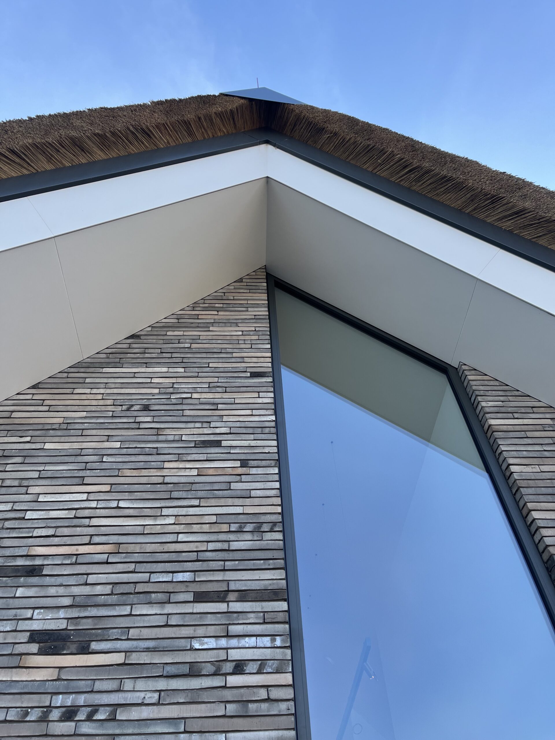 De geheel onderkelderde villa is ontworpen met natuurlijke, duurzame materialen en heeft een prachtige connectie met het tuingebied, overkapte buitenruimte en het omliggende water. De moderne rieten dakafwerking valt als een deken over de metselwerk basis.